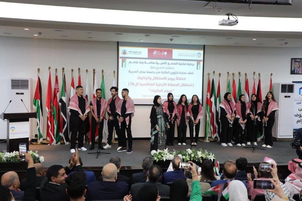 Embodying national pride and honoring Hashemite achievements, in a solemn atmosphere filled with a spirit of belonging and under the patronage of Her Royal Highness Princess Salha bint Asem—may God protect her—Amman Arab University held a grand celebration marking the 79th Independence Day of the Hashemite Kingdom of Jordan and Communities Day. The event was organized by the Deanship of Student Affairs and attended by Dr. Omar Mashhour Al-Jazy, Chairman of the University's Board of Trustees, Professor Dr. Mohammad Al-Widyan, President of Amman Arab University, a number of dignitaries, representatives of diplomatic missions in Jordan, assistant presidents, college deans, directors of administrative units, faculty and staff members, and a large gathering of university students.